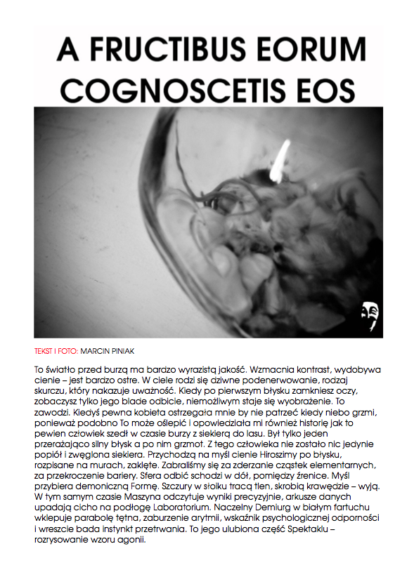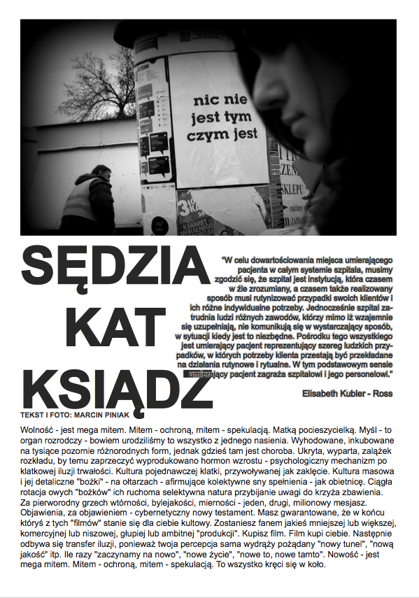 Kruche są podstawy królestwa. Michel Houellebecq „Cząstki elementarne” KOŚCIÓŁ I RATUSZ Pani prezydent Królowa i jej wierny chór – dwór zainstalowany jak lepka od pożądliwości rdza na wszelkich urządzeniach, w całym mieście, obtoczona niczym kotlet schabowy w panierce swoich wiernych klakierów. Do tego mizeria z urzędniczej zmielonej masy ludzkiej segregującej ten nigdy niekończący się zapętlony dokumentalno – tabelkowy świat czystej formalnej Abstrakcji. Mięso.Masa.Urzędnicza Maszyna. Podatki, ulgi, derywatywy. Spółki pustego skarbca kartonowego państwa teoretycznego, którym rządzi ekipa Warsaw Shore w garniturach zarządzana przez inną mroczniejszą ekipę z Pogranicza. Kwantowa rzeczywistość równoległych wszechświatów zapadniętych w sobie w wyniku konstrukcyjnej prowizorki. Kolesie kolesiom…