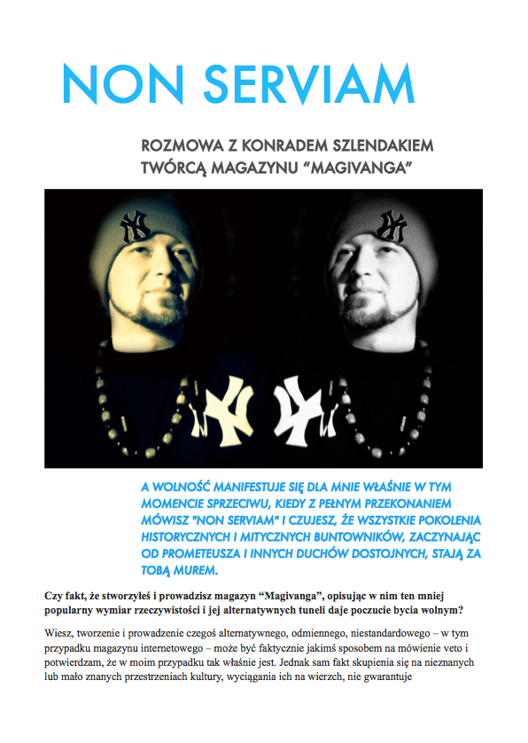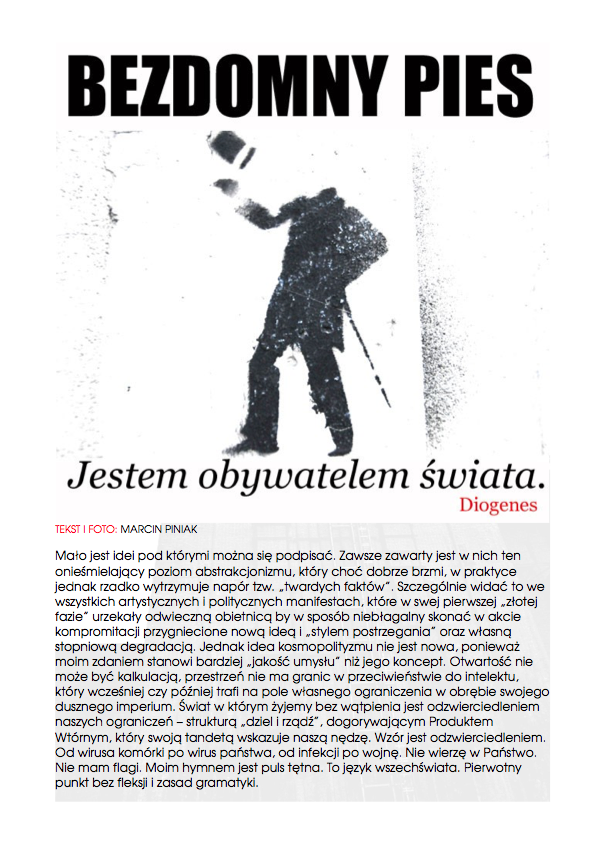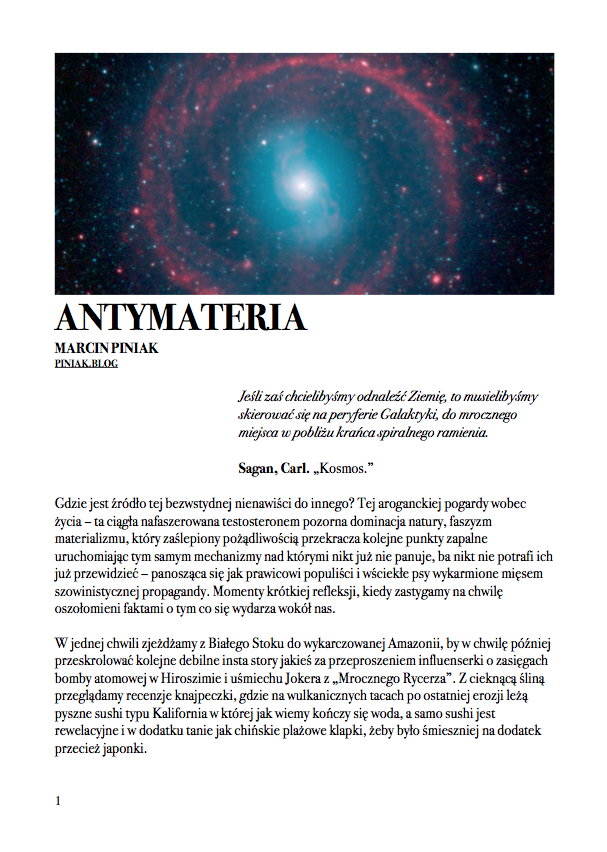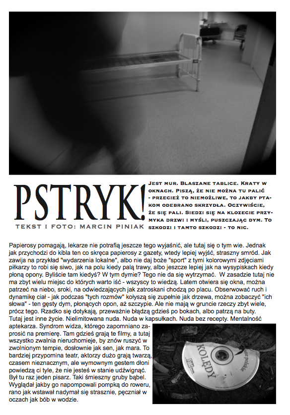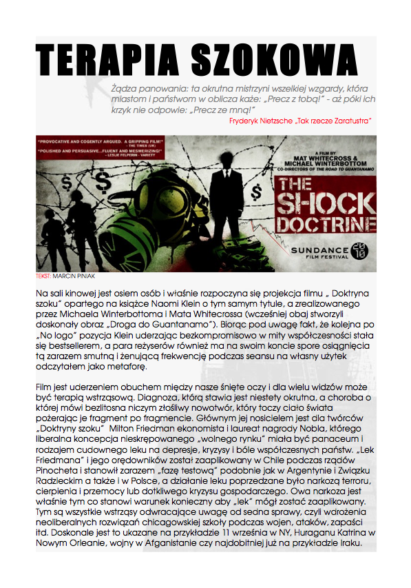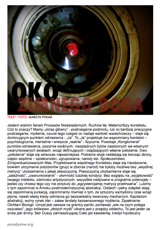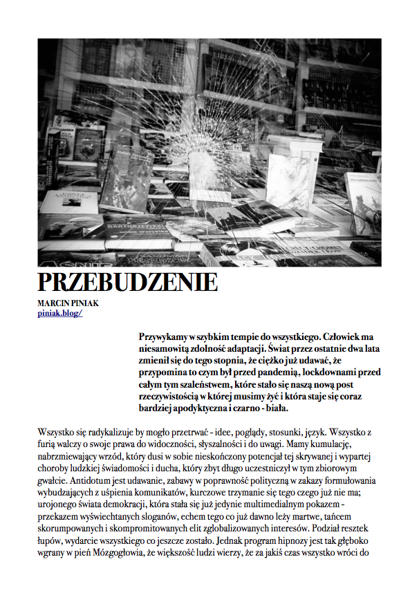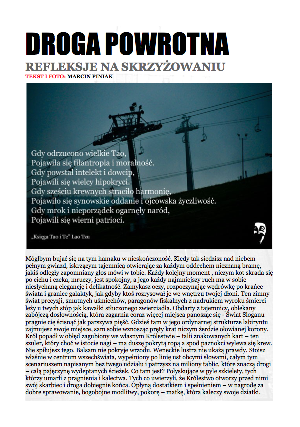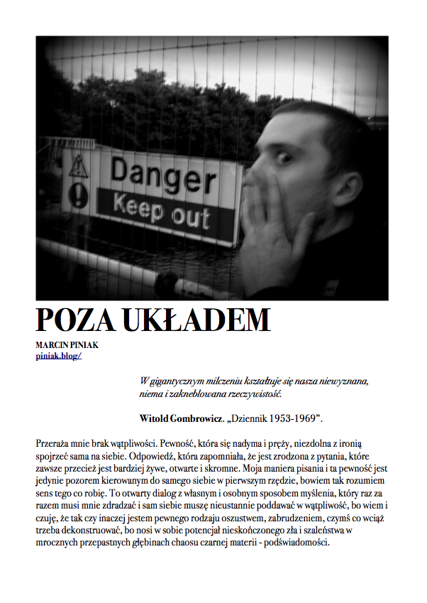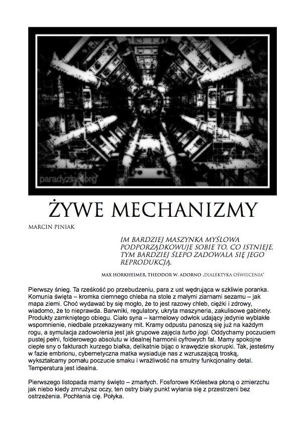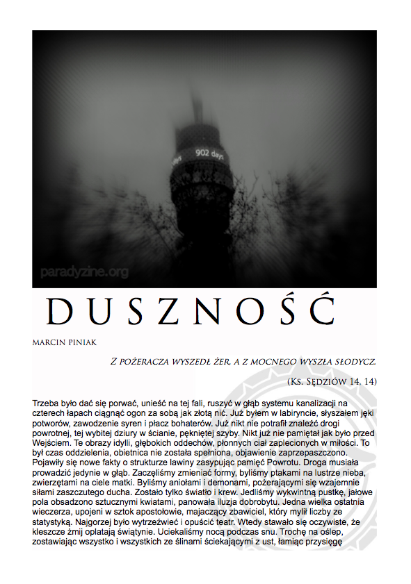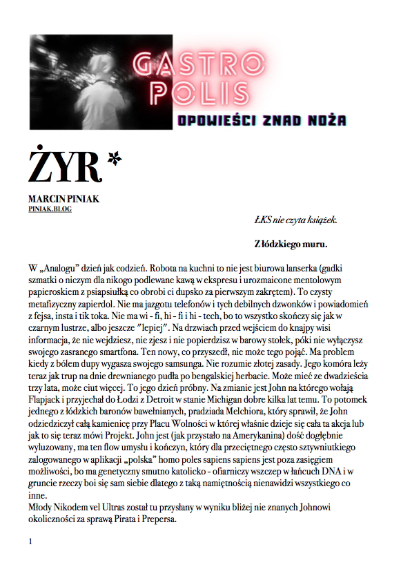 Po nocnym śnie,O wilgotnym świcie,W chłodnym brzasku,TwarzeZnużone pragnieniami,Opustoszałe z marzeń. Carl Sandburg, Wiersze chicagowskiez angielskiego przełożył Jacek Dehnel CZARNY PIĄTUNIO Zazwyczaj w piątki cywilizowany świat schodzi do poziomu komórkowego. Mało ozdobiony pantofelek zagubiony przez królewnę na balu – gdzie jest wszystko na „p” i znacznie więcej. Urodzinowy tort dla pana prezydenta. Barbie miała leczenie kanałowe zębów mądrości. Nie wyszło. Pocałunek żaby – ofiary śmiertelne. Mówią o toksynach z puszczy, od tubylców – jednak tuż przed nimi niczym przysłowiowa belka rozpościera się Wielkie Toksyczne Królestwo. Napędzająca tą globalną techno imprezę Czarna Maź nieubłaganie wyczerpuje swoje zasoby, zatem w akcie rosnącej desperacji…