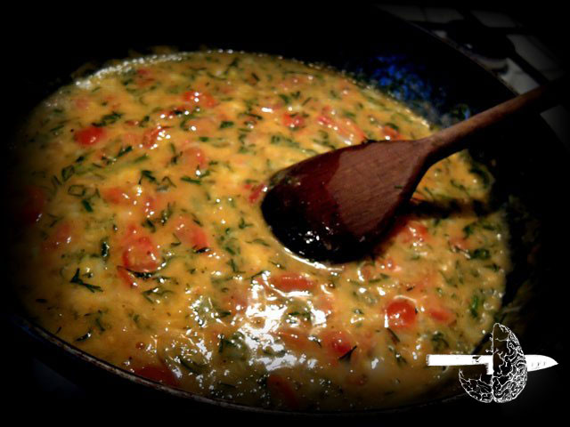 Ogarnąć najbliższą przestrzeń i najbliższych ludzi, odnaleźć poczucie zupełnie małego sensu – to jest wyczyn! Zatem pomidory wrzucamy na patelnię i rumienimy na złoto na masełku. Uwielbiam kręcić drewnianą łyżką na patelce – to mnie spełnia, daje poczucie pełni i pełnej kontroli. W tym punkcie ceremonii magicznej uwalniamy zmysł powonienia, rozkoszujemy się własnym uczestnictwem w procesie kosmicznej kreacji! Patelka jest jak galaktyka, a pomidory jak rotacje 56 planet. Widzieć jak to wszystko krąży i wiruje – cóż za spektakl! Dalej znów schodzimy na ziemię możemy poczuć samą ziemię – Koperek (Anethum). Z mojej ogromnej sympatii do królewskiej kultury fetyszu (Japonii) koperek kroję właśnie japońskim nożem, bo co jak co, ale noże mają niezawodne i doprawdy ostre, etos samuraja przed seppuku daje tu o sobie znać. Całkiem ładne mają też bajki i opowiastki, jednak gdzieś po drodze do „optymalizacji i wydajności” zapomnieli o tym – Fukuszima im o tym przypomina, że może warto się zatrzymać i poczytać kilka mądrych bajek dla dzieci. Zatem dalej trzeba nam rozbić kilka jajek do fantastycznego naczynia „miedziankowej” mistrzyni ceramicznej Klaudii Gawin. Popieprzyć trochę dla równowagi, posolić (co jest zasługą sąsiedzkiej przysługi Pablito Sroczyńskiego i Moniki Lotkowskiej z „Cohabitatu”, gdyż kucharz odkrył brak soli) i oczosnkować zmielonym czosnkiem. Czosnek jest Mistrzem, jest Królem zimowych poranków podobnie jak imbir i w temperaturach „białej pory elementu wody” doskonale podnosi to co trzeba. Tutaj zbliżamy się do finału. Łączymy niebo i ziemię, ogień z wodą – wlewamy jajka na patelkę!