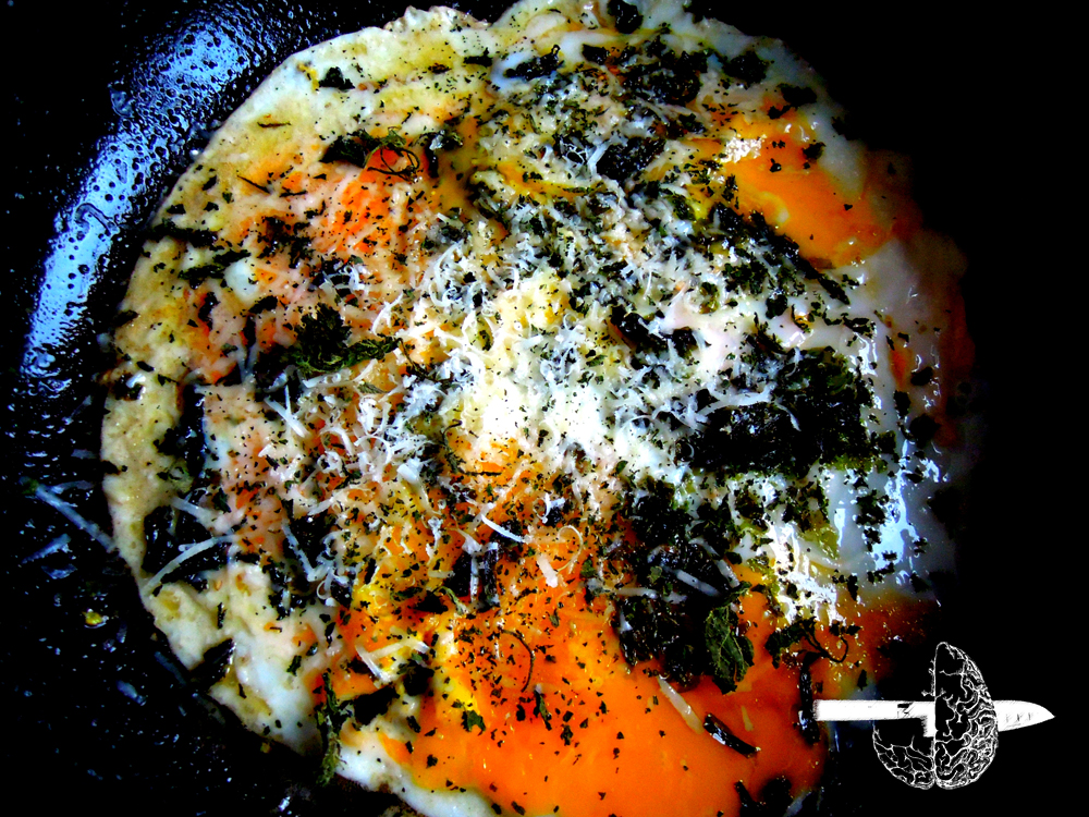 Patelka, masło, trzy jajka koniecznie od szczęśliwych ( podobno) kur – jak mawiają panie ze wsi nie ścięte, sól, pieprz, starty parmezan i wysuszona pokrzywa oraz wodorosty prażone.