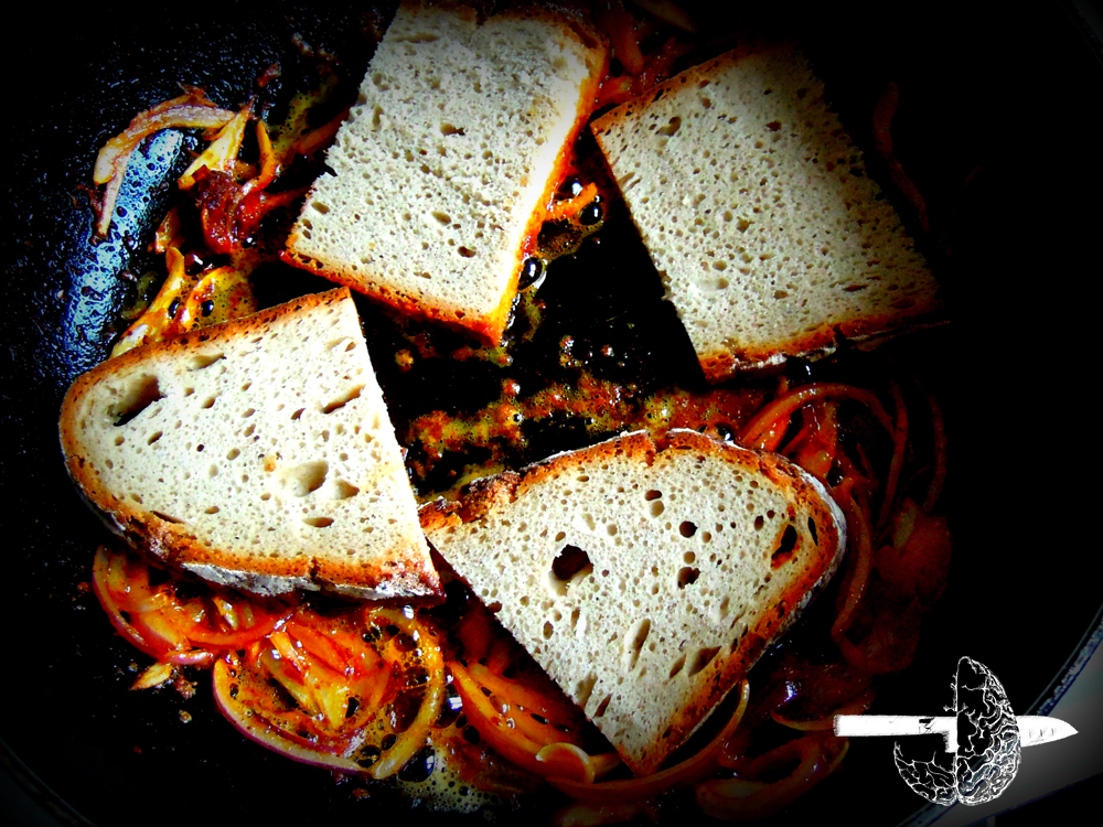 Najpierw cebulowe tosty z czerwonym chili na maśle (masło, chili, cebula czerwona i gdy już rumiana wrzucamy kromki prawdziwego chleba na zakwasie (tym razem pytlowy pszenny) i zaczerwienione kromki układamy na talerzu i robimy…