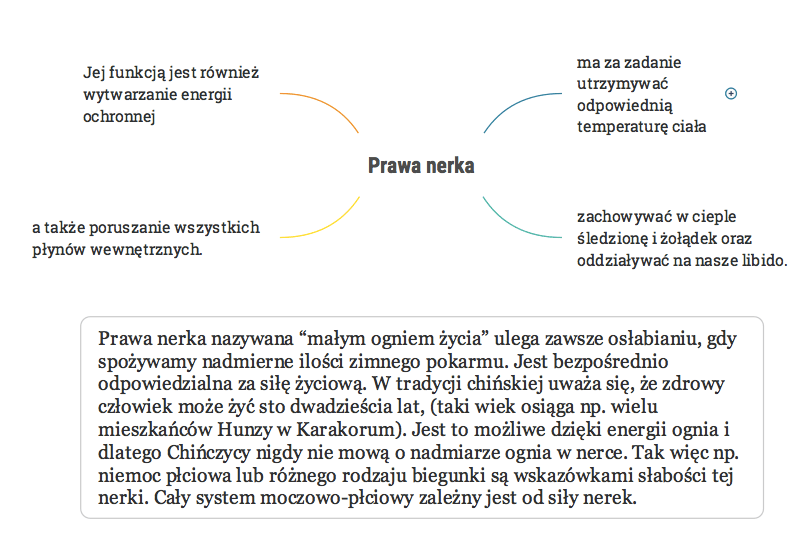 Nerki są korzeniem i podstawą całego organizmu. Dostarczają nam energię i ciepło. Są źródłem i podstawą jakości Yin i Yang co oznacza, że ich kondycja w głównej mierze o tym jak się czujemy zarówno na poziomie fizycznym jak i psychicznym, bowiem od ciała zależy energia, a od energii zależy stan naszego umysłu. Te trzy podstawowe elementy w jakich się przejawiamy czyli ciało, energia i umysł są od siebie współzależne i tylko pozornie możemy je oddzielić. Symbolicznie tą trójcę określa Niebo (tien) jako pustka, przestrzeń – umysł, Ziemia (dee) jako stałość, cielesność, materia, oraz Człowiek (ren) jak przejawienie dynamicznego elementu energii.