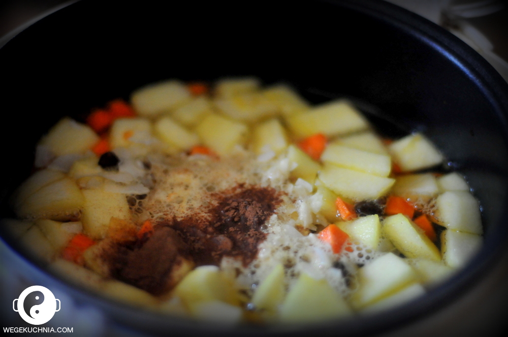 DODAĆ POKROJONĄ W KOSTKĘ MARCHEW I JABŁKO W POŁOWIE GOTOWANIA