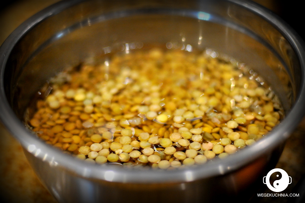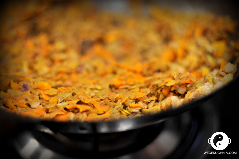 DO NACZYNIA ŻAROODPORNEGO NA SPÓD DAJEMY SMAŻONĄ CEBULĘ, MARCHEW I SOCZEWICĘ