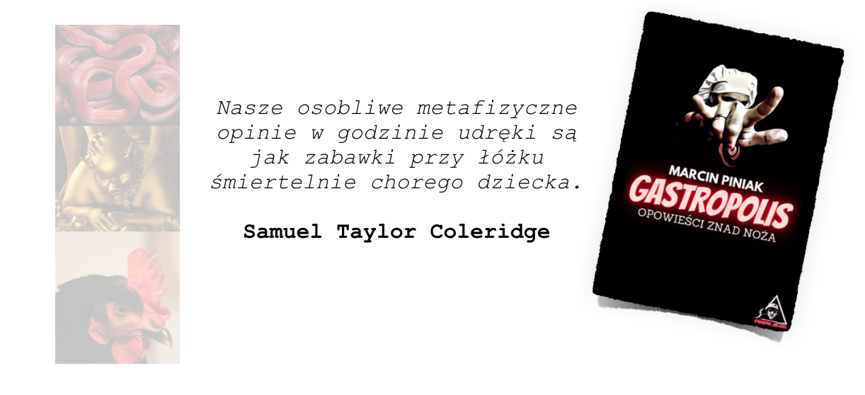 Pisanie jest twoim zbawieniem. Twoją samotną wyspą na tym gęstym i śmierdzącym oceanie absurdu, który w każdej chwili wyrzuca na brzeg żywe trupy snujące się później ulicami w poszukiwaniu krótkotrwałego zaspokojenia tych neurotycznych impulsów, które generuje ignorancja, pożądanie i odpychanie. Ta stara maszyna do pisania staje się twoją arką przymierza, szalupą ratunkową, chwilą czystej nieuwarunkowanej miłości do słowa i wyobraźni. Do magii, która tworzy twój intymny alternatywny wszechświat, który zaludniają istoty zrodzone z ciebie i stworzone na twoje podobieństwo. Niedostrzegalne przez detektory zmysłów duchy opiekuńcze. To osobista duchowa inicjacja, która nie jest związana z żadną stworzoną przez ludzkie myślenie tradycją duchową, która aby przetrwać musi werbować kolejnych wiernych wyznawców podległych Sloganowi, armie klonów w niedorzecznej odwiecznej wojnie „dobra” i „zła”, która doprowadziła nas na sam skraj szaleństwa.