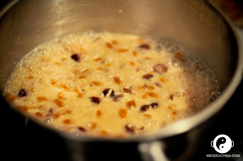 Zagotować wodę z mlekiem ryżowym i dodać umyty brązowy ryż. Dodać owoce goji i żurawinę. Jabłka obrać, posiekać w paski i podsmażyć na odrobinie oleju ryżowego posypać cynamonem i szczyptą curry na koniec dodać posiekane w paski banany (nie smażyć). Kiedy ryż już jest miękki dodać mleko kokosowe (uzyskując odpowiednią dla nas gęstość). Nałożyć do miseczki, dodać jabłka i banany i zalać sosem daktylowym (zblendować daktyle i 250 ml mleka kokosowego – opcjonalnie można dodać banany) oraz posypać ziarnami słonecznika i dyni. Smacznego.