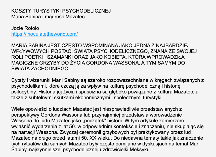 „Wkrótce do Huautla zaczęli przybywać turyści w poszukiwaniu mistycznych, zmieniających świadomość doświadczeń, co jest jednym z najbardziej znanych przykładów tego, co obecnie nazywa się turystyką psychodeliczną. Hipisi, a także znani artyści i postacie kontrkultury, tacy jak John Lennon, pielgrzymowali do Huatla, aby uczestniczyć w psychodelicznych rytuałach, często prowadzonych przez Sabinę, w ramach pielgrzymki nazywanej czasem „inwazją beatników”.