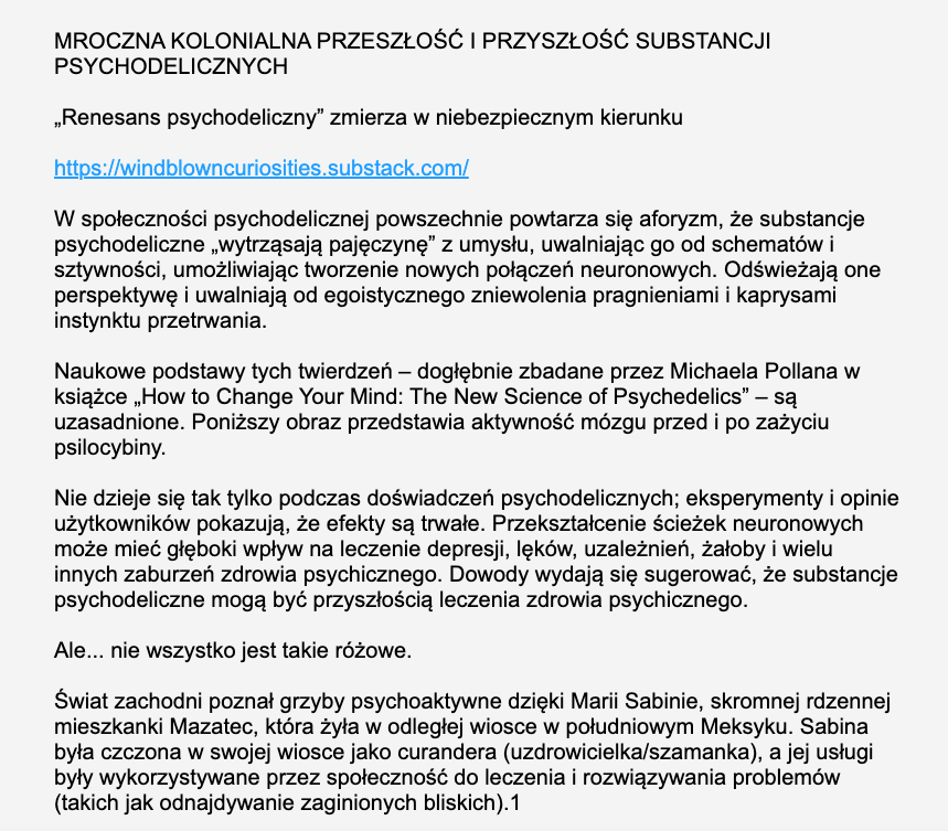 „Renesans psychodeliczny” jest wyjątkowy, ponieważ potencjał tych leków jest niezaprzeczalny. Ale nie jest to jedyna wyjątkowa rzecz. To tylko kolejny rozdział w burzliwej historii samolubnych, pseudorewolucyjnych hipokrytów, którzy nie rozumieją historii tych związków i nie chcą się o nich dowiedzieć. Wiem to, ponieważ sam byłem jednym z tych hipokrytów, gdy miałem dwadzieścia kilka lat.”